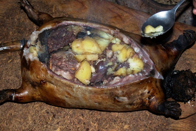 vagy edényt a hús főzéséhez. Valójában egyáltalán nem használ semmilyen edényt. Ehelyett a badag úgy készül, hogy a húst az állat saját bőrén főzik.