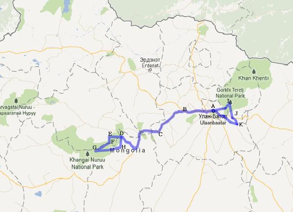 H; Huzsirt, vissza Ulánbátor I; Terelj Nemzeti Park J; Erdene (Dzsingisz kán óriás lovasszobra) K; XIII. Század Nemzeti Park (Hét törzs) vissza Ulánbátor